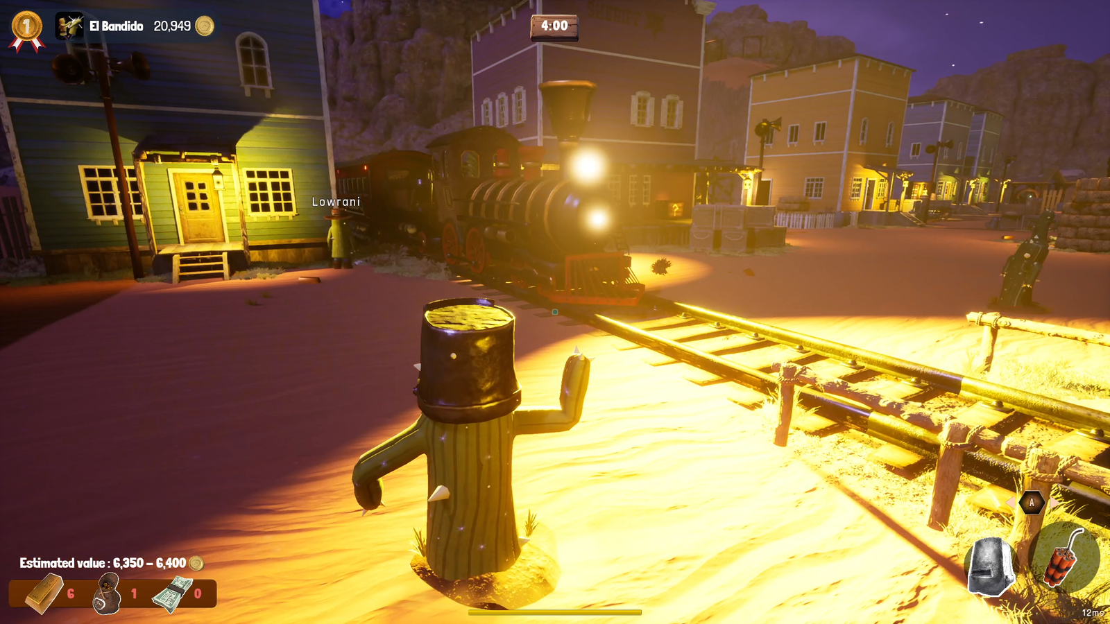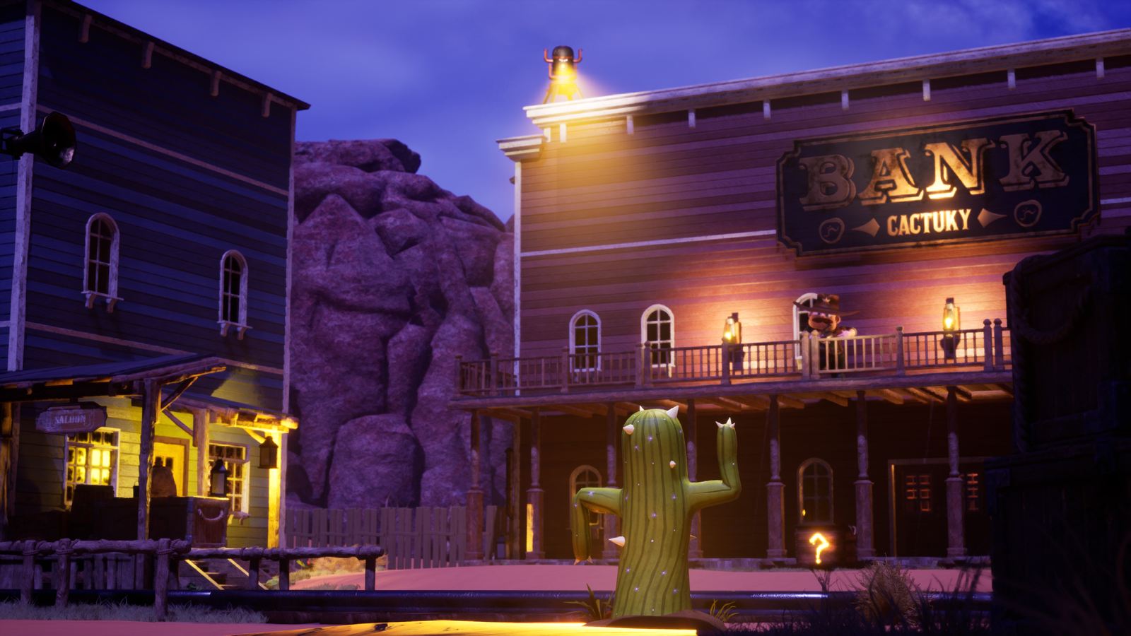 Play as a cactus bandit in a quirky nighttime western! Up to 6 players compete to rob the bank, avoiding the armed sheriff and spotlights. Use your bonuses and adapt your strategy to unexpected events to maximize your loot!